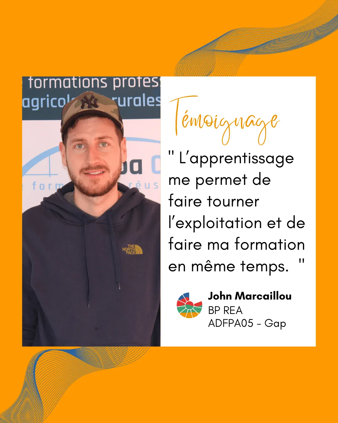 Bonjour, je m’appelle John Marcaillou, j’ai 27 ans. Je vis à Gap dans les Hautes-Alpes. Je suis actuellement en BP Responsable d’entreprise Agricole au centre de formation de l’ADFPA 05 dans le but de reprendre une exploitation agricole familiale dans le domaine de l’équin.