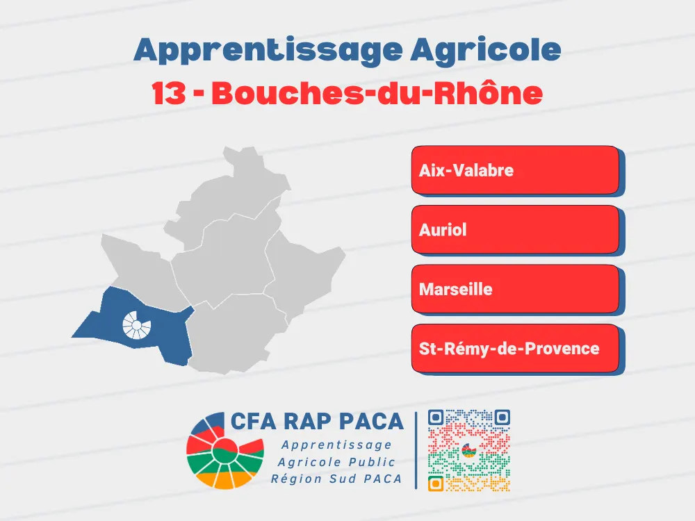 Le département des Bouches-du-Rhône (13), à la croisée de la Provence et de la Méditerranée, accueille plusieurs établissements engagés dans la formation agricole par apprentissage : le Campus Nature Provence réparti sur Valabre (Aix-en-Provence), Auriol et Marseille, ainsi que Alpill’Campus à Saint-Rémy-de-Provence.