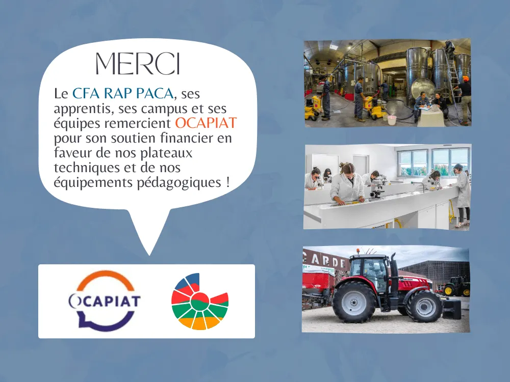 Le CFA Régional Agricole Public PACA remercie chaleureusement OCAPIAT pour son engagement constant aux côtés de l’apprentissage agricole public dans la région Provence–Alpes–Côte d’Azur. Ce partenariat s’inscrit dans une collaboration de longue date au service des métiers du Vivant et de la formation des jeunes.