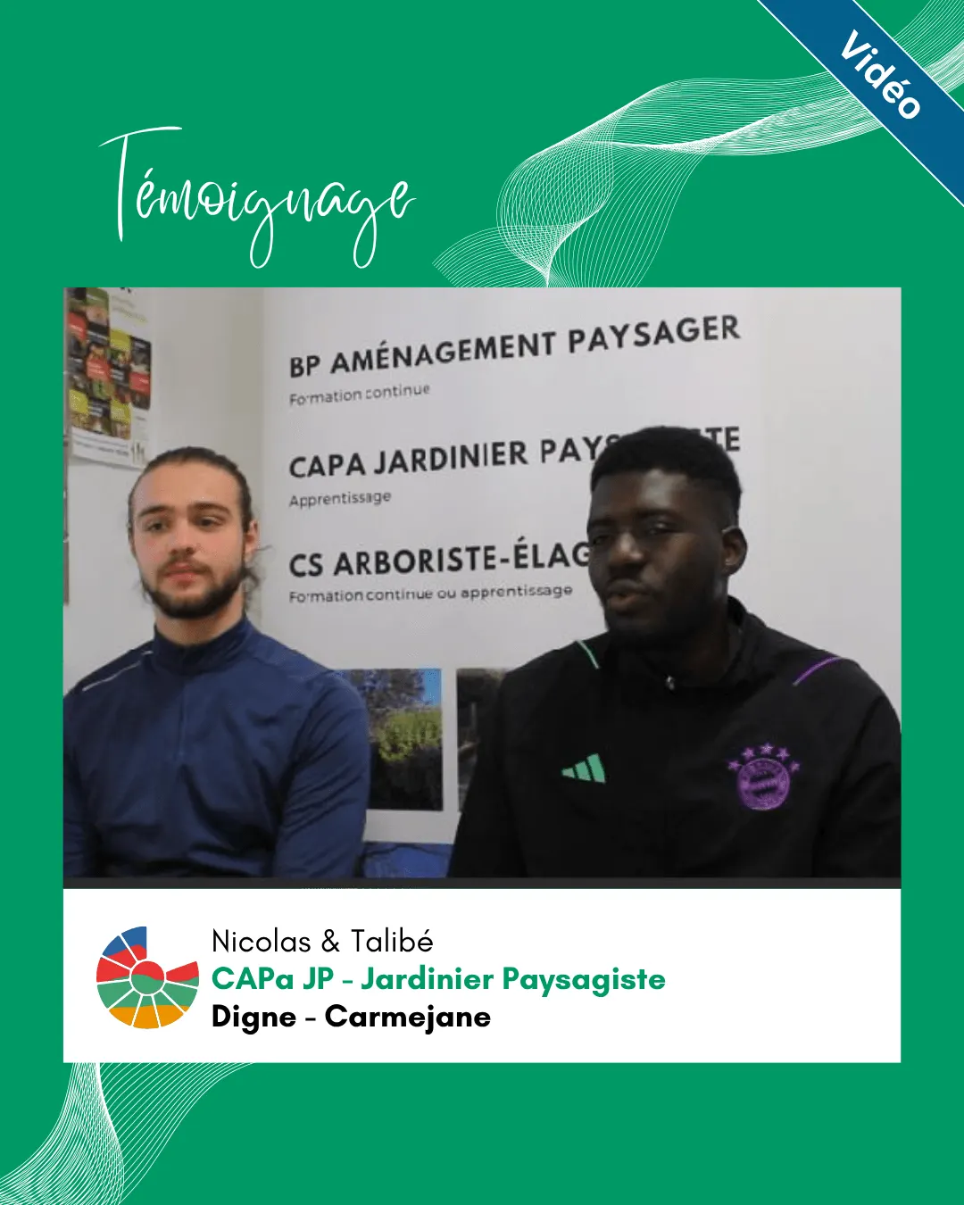 Talibé DOUCOURE : Bonjour, je m'appelle Talibé DOUCOURE. Je suis au lycée de Carmejane, je prépare le CAPa JP (jardinier paysagiste) et je suis en première année.